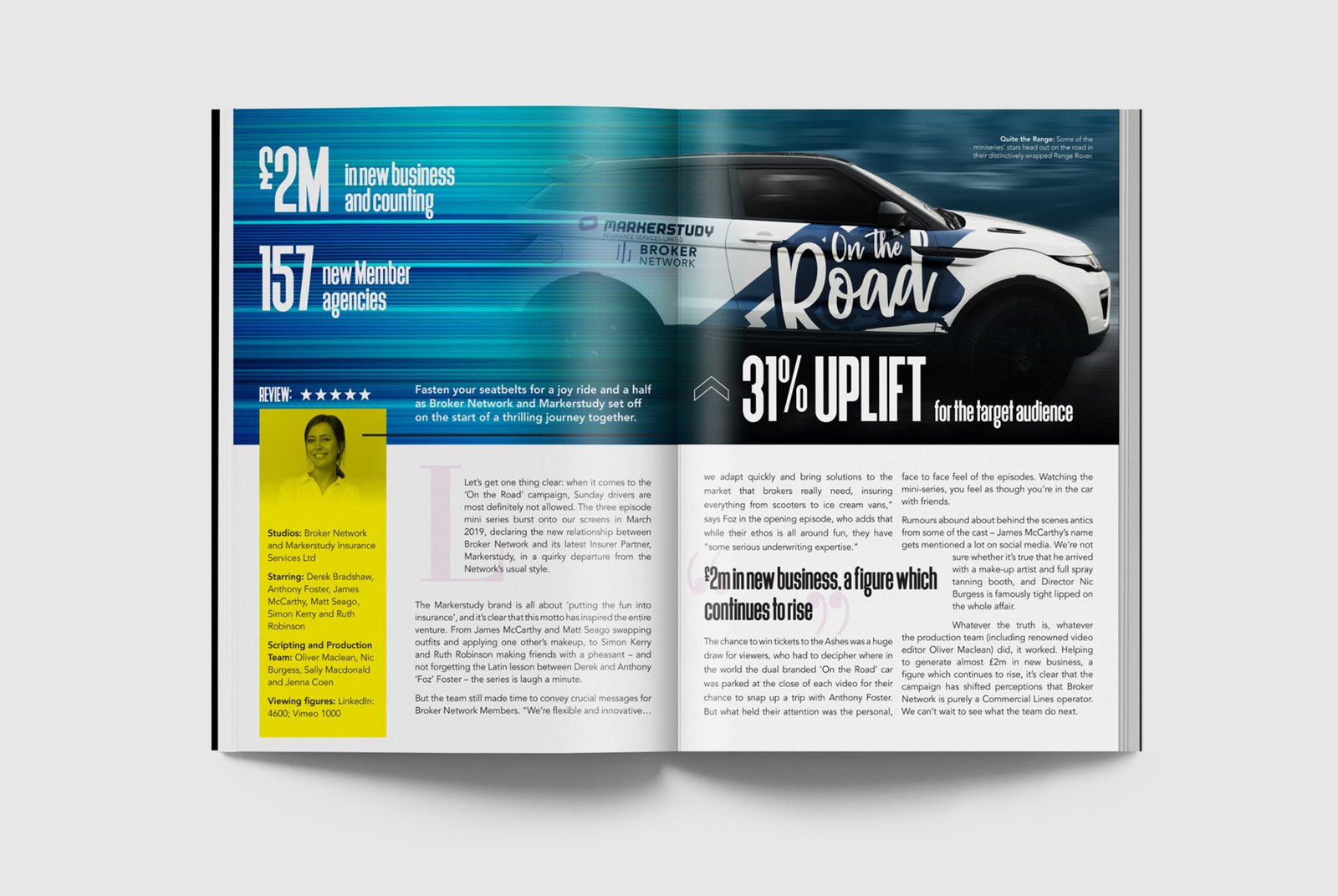 On the Road was a dual branded marketing project between Broker Network and Markerstudy for which we were required to produce a variety of deliverables. The project spanned all mediums of design including video editing, poster design, brochure design, social promotion and award entrance. The project was nominated for several industry awards and won the Digital Marketing Campaign of the Year at the Insurance Post Creative & Innovation Awards.